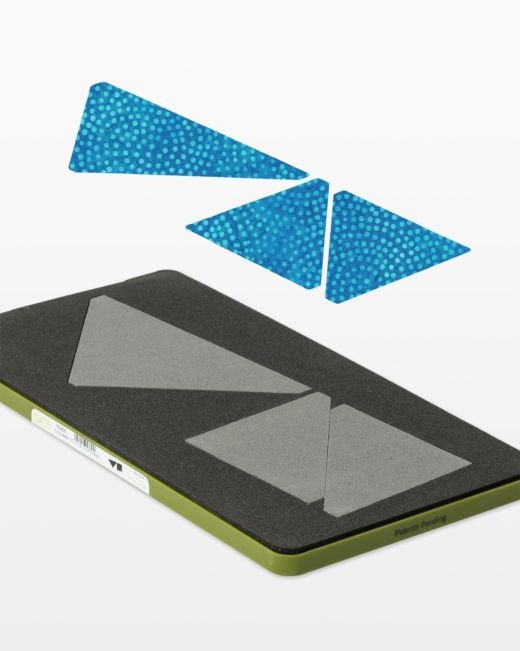 - 3" Finished Half Square Triangles: Cut 4 3/4" strips across the width of fabric. Fanfold into 4" widths. Place on selected blade and cut. Cut 20 triangles across the width of fabric. One yard of 40" wide fabric cuts 140 triangles.