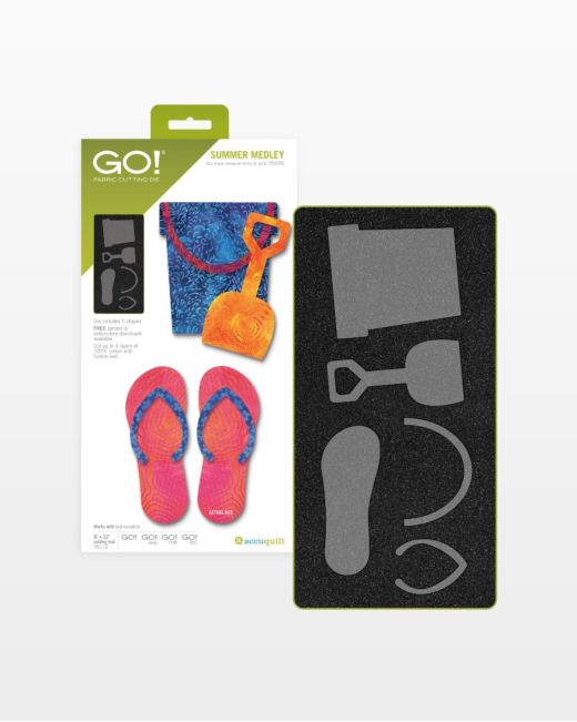 Life’s a beach with the Charm Pack-friendly GO! Summer Medley. Bring sun and sand to your quilting and sewing projects with the flip-flop style sandals, bucket and shovel appliqué shapes in the set. Cutting several is easy-breezy. Simply apply fusible web to the wrong side of fabric and cut four of each applique shape in one pass through your GO! cutter.