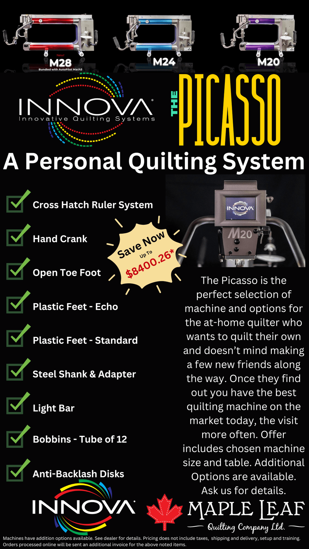 The Picasso is the perfect selection of machine and options for the at-home quilter who wants to quilt their own and doesn’t mind making a few new friends along the way. Once they find out you have the best quilting machine on the market today, the visit more often. Offer includes chosen machine size and table. Additional Options are available. Ask us for details.