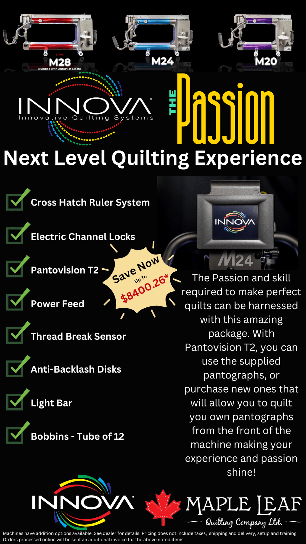 [{"id":261165219874,"handle":"all-longarm-quilting-machines","title":"All Longarm Quilting Machines","updated_at":"2025-10-13T05:06:00-06:00","body_html":"\u003cdiv style=\"text-align: center;\"\u003e\u003ca href=\"https:\/\/mapleleafquiltingcompany.com\/pages\/financing\" title=\"MLQC New financing source\"\u003e\u003cimg src=\"https:\/\/cdn.shopify.com\/s\/files\/1\/1106\/5488\/files\/RBC_PayPlan_WebBanner_Leaderboard_PayOverTime.png?v=1749055933\" alt=\"\"\u003e\u003c\/a\u003e\u003c\/div\u003e\n\u003cdiv style=\"text-align: center;\"\u003e\u003cstrong\u003eDue to the size and weight of these items, extra shipping charges may apply. Please contact us for a personalized shipping quote based on your location.\u003c\/strong\u003e\u003c\/div\u003e\n\u003cdiv style=\"text-align: center;\"\u003e\u003cbr\u003e\u003c\/div\u003e\n\u003cdiv style=\"text-align: center;\"\u003eThis collection includes longarm quilting machines from Innova, Janome and Husqvarna Viking. Sizes range from 16\" sit-down to 30\" heads and 14' tables.\u003c\/div\u003e\n\u003cdiv style=\"text-align: center;\"\u003e\u003cbr\u003e\u003c\/div\u003e\n\u003cdiv style=\"text-align: center;\"\u003eAll Longarm machine orders are special order only and will be placed within 1 business day of purchase. Standard shipping times vary based on brand, size and complexity. Call store for more information. \u003c\/div\u003e","published_at":"2021-05-06T12:40:58-06:00","sort_order":"best-selling","template_suffix":"","disjunctive":false,"rules":[{"column":"tag","relation":"equals","condition":"Longarm Machine"}],"published_scope":"global","image":{"created_at":"2025-09-14T14:08:46-06:00","alt":"All Longarm Quilting Machines - Maple Leaf Quilting Company Ltd. ","width":450,"height":350,"src":"\/\/mapleleafquiltingcompany.com\/cdn\/shop\/collections\/all-longarm-quilting-machines-2344778.jpg?v=1757880527"}},{"id":178979373090,"handle":"sewing-and-embroidery-machines","title":"All Sewing and Embroidery Machines","updated_at":"2025-10-25T05:01:16-06:00","body_html":"\u003cdiv style=\"text-align: center;\"\u003e\u003ca href=\"https:\/\/mapleleafquiltingcompany.com\/pages\/financing\" title=\"MLQC New financing source\"\u003e\u003cimg src=\"https:\/\/cdn.shopify.com\/s\/files\/1\/1106\/5488\/files\/RBC_PayPlan_WebBanner_Leaderboard_PayOverTime.png?v=1749055933\" alt=\"\"\u003e\u003c\/a\u003e\u003c\/div\u003e\n\u003cp style=\"text-align: center;\"\u003e\u003cstrong\u003eDue to the size and weight of these items, extra shipping charges may apply. Please contact us for a personalized shipping quote based on your location.\u003c\/strong\u003e\u003c\/p\u003e\n\u003cp style=\"text-align: center;\"\u003eOur collection of Brother, Janome, Elna and Husqvarna Viking sewing machines are available for financing. \u003cmeta charset=\"utf-8\"\u003e\u003cspan\u003eAll machines are available for order. Machines not currently in stock will be ordered on the next business day. Normal delivery time to the store is about a week barring any delays from the manufacturer. All shipping orders are redirected within 1 business day. \u003c\/span\u003e\u003c\/p\u003e\n\u003cp style=\"text-align: center;\"\u003e\u003cspan\u003e\u003cmeta charset=\"utf-8\"\u003ePlease note that branded products (Husqvarna Viking, Brother, Janome, Elna) are not for sale outside of Canada. Purchases made will be cancelled. For international sales, please contact your local dealer.\u003c\/span\u003e\u003c\/p\u003e","published_at":"2020-11-09T18:15:23-07:00","sort_order":"best-selling","template_suffix":"","disjunctive":true,"rules":[{"column":"tag","relation":"equals","condition":"Sewing Machine"},{"column":"tag","relation":"equals","condition":"Quilting Machine"},{"column":"tag","relation":"equals","condition":"Embroidery Machine"},{"column":"tag","relation":"equals","condition":"Serger"},{"column":"tag","relation":"equals","condition":"Machine"}],"published_scope":"global","image":{"created_at":"2025-09-14T14:08:47-06:00","alt":"All Sewing and Embroidery Machines - Maple Leaf Quilting Company Ltd. ","width":362,"height":139,"src":"\/\/mapleleafquiltingcompany.com\/cdn\/shop\/collections\/all-sewing-and-embroidery-machines-4554784.jpg?v=1757880528"}},{"id":272102129698,"handle":"innova-machines-and-computerization","title":"Innova Machines and Computerization","updated_at":"2025-09-14T14:09:53-06:00","body_html":"","published_at":"2022-06-03T15:19:25-06:00","sort_order":"best-selling","template_suffix":"","disjunctive":false,"rules":[{"column":"vendor","relation":"equals","condition":"Innova"},{"column":"tag","relation":"equals","condition":"Machine"},{"column":"type","relation":"equals","condition":"Machine"}],"published_scope":"global","image":{"created_at":"2025-09-14T14:09:53-06:00","alt":"Innova Machines and Computerization - Maple Leaf Quilting Company Ltd. ","width":1024,"height":682,"src":"\/\/mapleleafquiltingcompany.com\/cdn\/shop\/collections\/innova-machines-and-computerization-2167085.png?v=1757880593"}},{"id":474980516144,"handle":"innova-packages","updated_at":"2025-09-14T14:09:11-06:00","published_at":"2024-05-31T12:32:41-06:00","sort_order":"best-selling","template_suffix":"","published_scope":"global","title":"Innova Packages","body_html":"\u003cp\u003eInnova pre-packaged machine bundles are the perfect way to get the machines you want and save money. See these amazing deals and get more information in-store today!\u003c\/p\u003e\n\n\u003cp\u003e\u003ca href=\"https:\/\/go.mycreditportal.ca\/maple-leaf-quilting-company\/andrew-bentley\/create-application\" _blank=\"\"\u003e\u003cimg src=\"https:\/\/cdn.shopify.com\/s\/files\/1\/1106\/5488\/files\/Innova.png?v=1723655925\" alt=\"Financing Plans Up To 100k\" style=\"text-align: center; width: 500px; display: block; margin-left: auto; margin-right: auto;\"\u003e\u003c\/a\u003e\u003c\/p\u003e\n\u003cp\u003e \u003c\/p\u003e\n\u003c!----\u003e","image":{"created_at":"2025-09-14T14:09:10-06:00","alt":"Innova Packages - Maple Leaf Qui