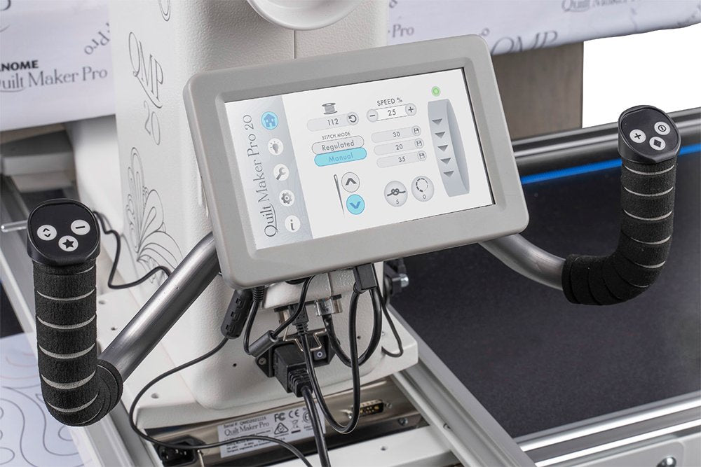 The rear handlebars and display enable you to quilt from the back of the Machine. Use pantographs and ruler guides for edge-to-edge quilting in conjunction with the optional laser light.