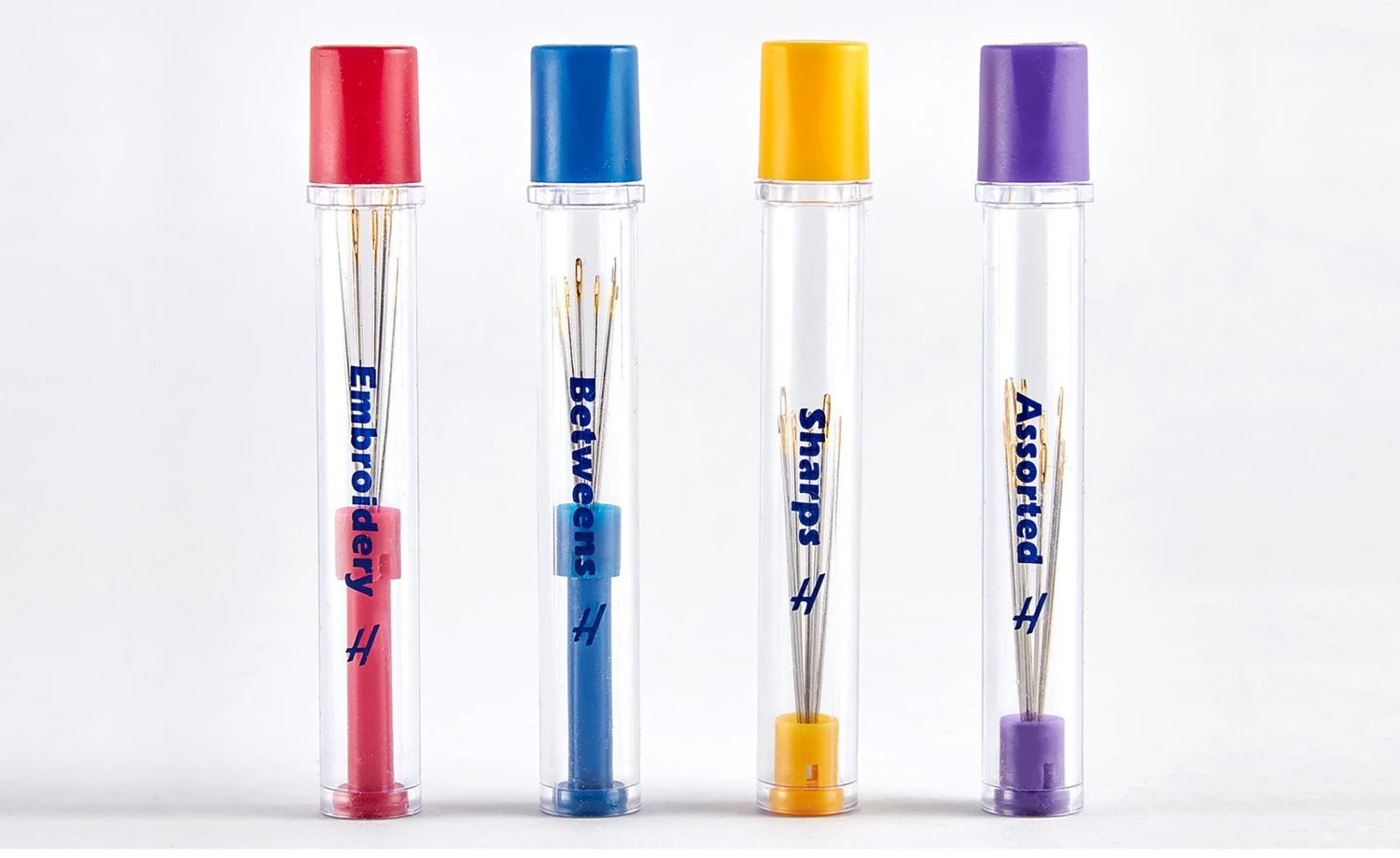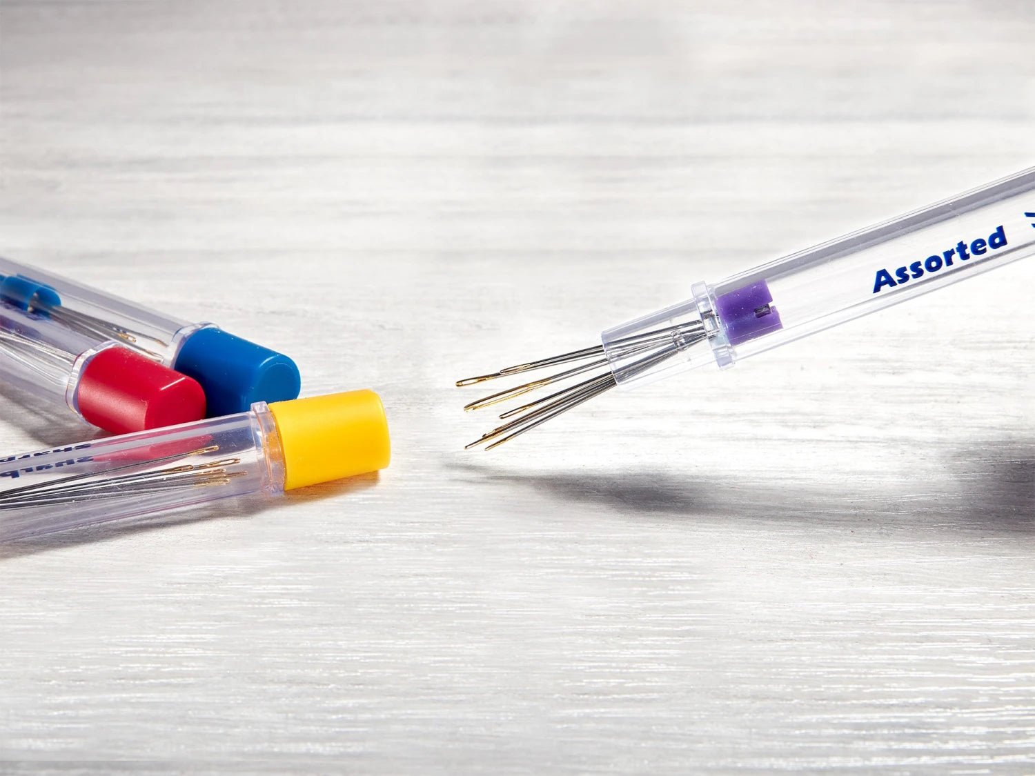 Each tube contains 8 gold eye needles with the needle type printed on the tube body.