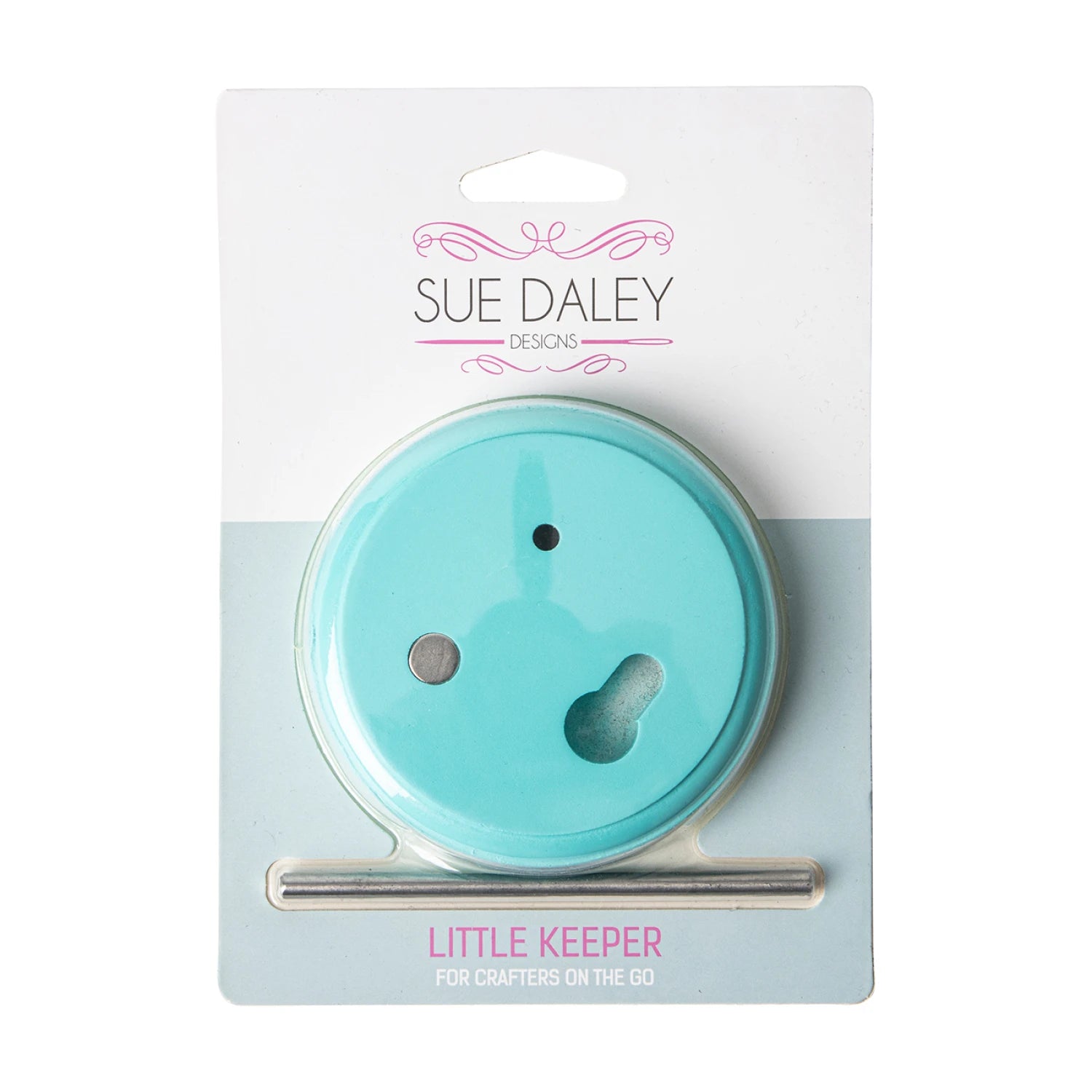 It includes a spindle to hold your thread, a spot for your glue pen, and a magnet to keep your needle in place.