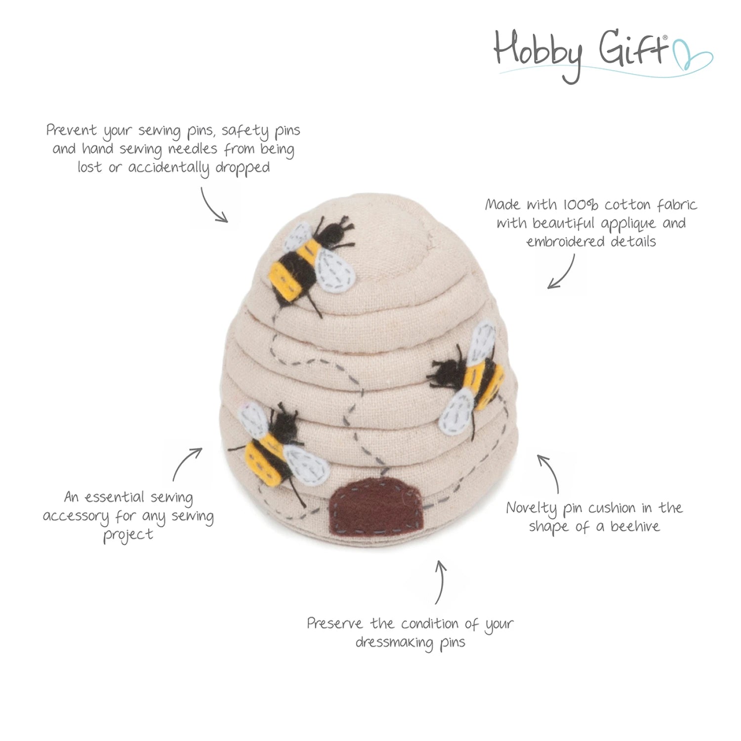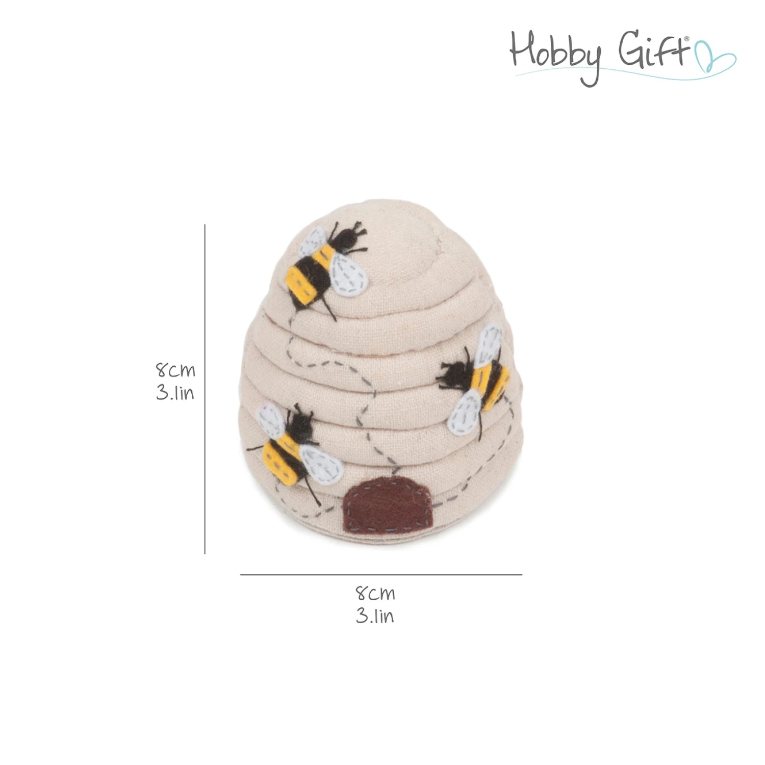 Shaped like a classic beehive in soft beige 100% cotton fabric, this delightful pin cushion features adorable embroidered black and yellow bees with white wings buzzing along dashed flight paths, complete with a cozy brown entrance at the base.