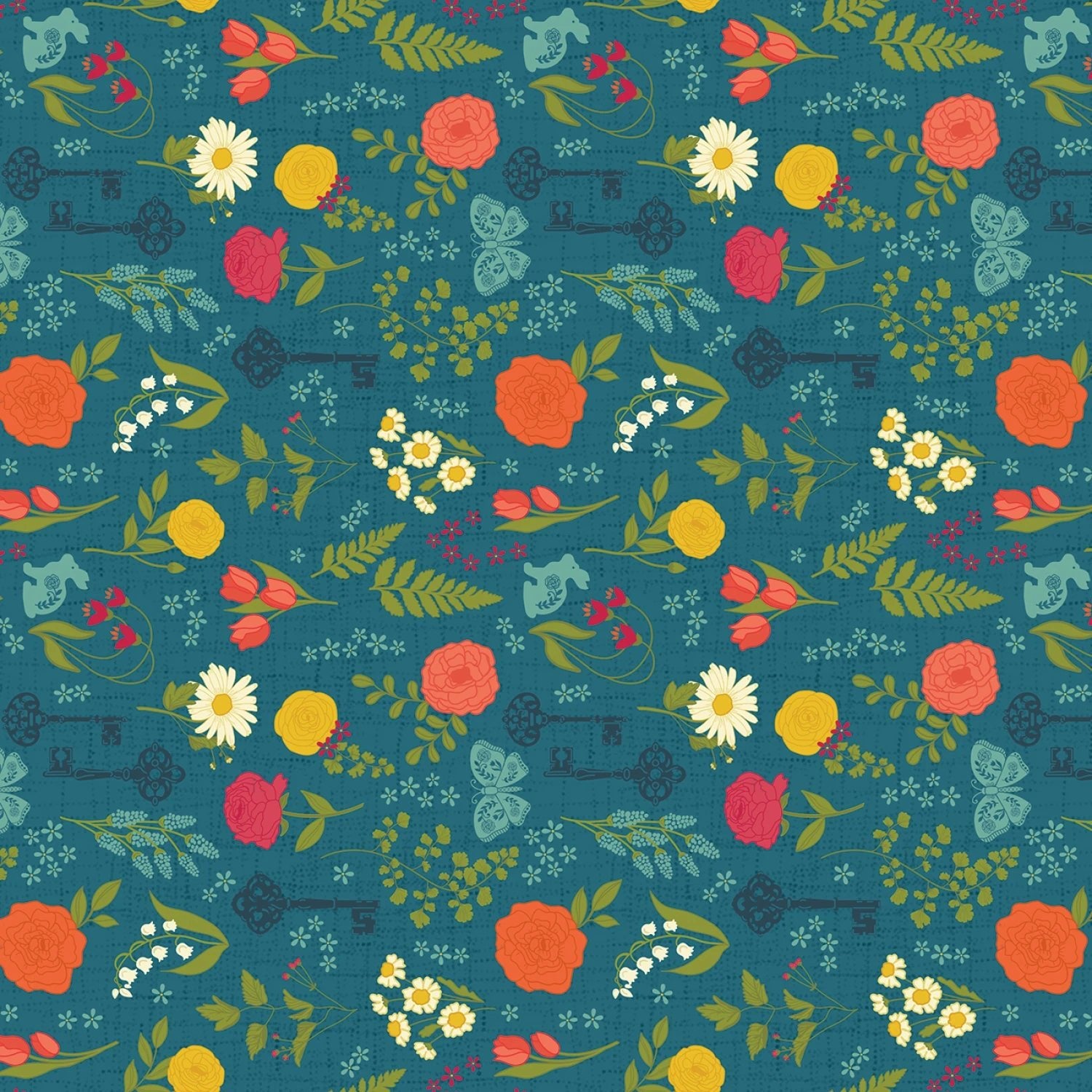 The collection includes vibrant blooms in shades of orange, red, and yellow, set against soft backgrounds, alongside intricate teal and blue designs with butterflies, keys, and lattice patterns.