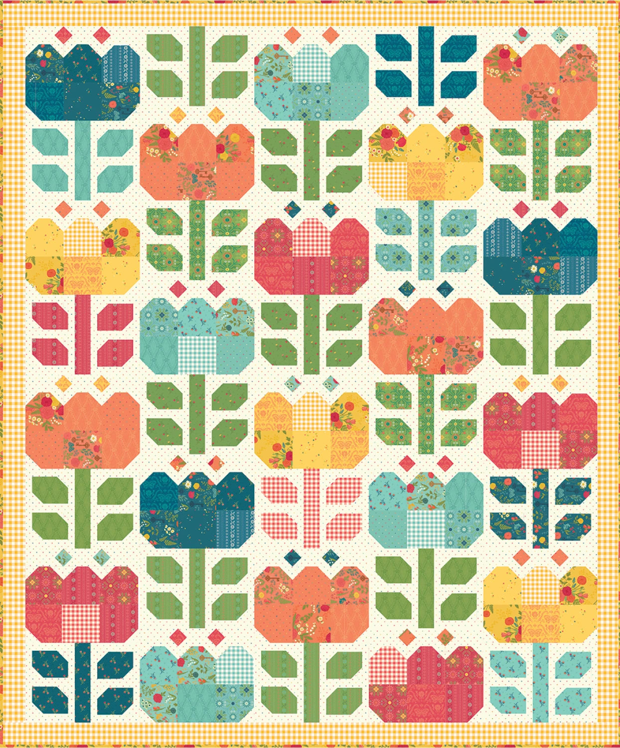 This quilt kit features a vibrant and cheerful design with a variety of tulips in full bloom, set against a cream background with a yellow border.