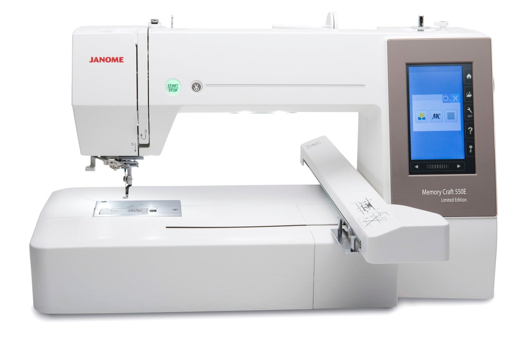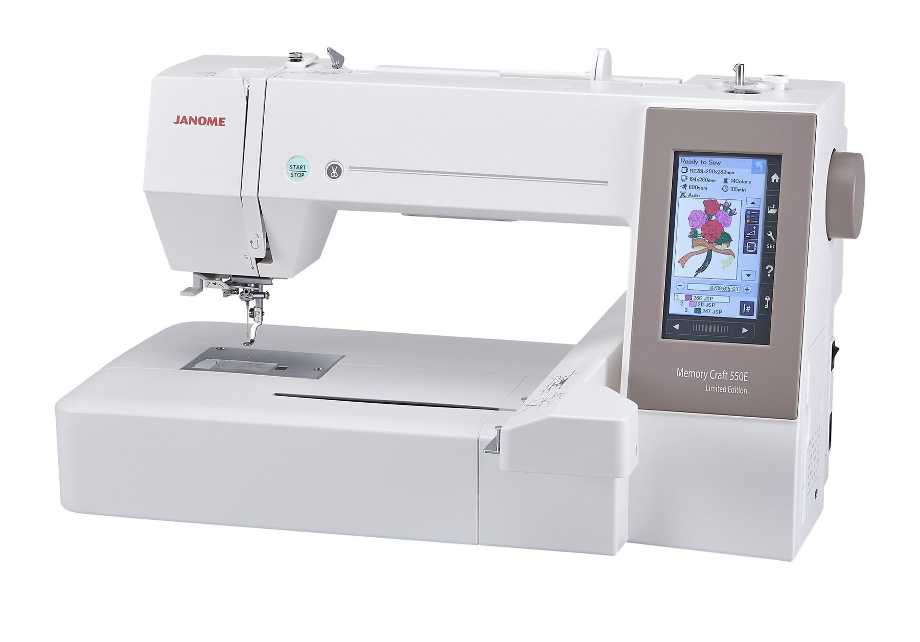 Janome's largest stand-alone embroidery machine with 7.9 x 14.2" of creative space. Open up a new world of possibilities with the Janome Memory Craft 550E LE. The perfect sewing companion personalizes the largest projects, easier and faster with embroidery speeds of up to 860 spm. Explore the rewarding joys of embroidery with the 4 included hoops, AcuStitch software and a USB drive with 30 exclusive large designs.