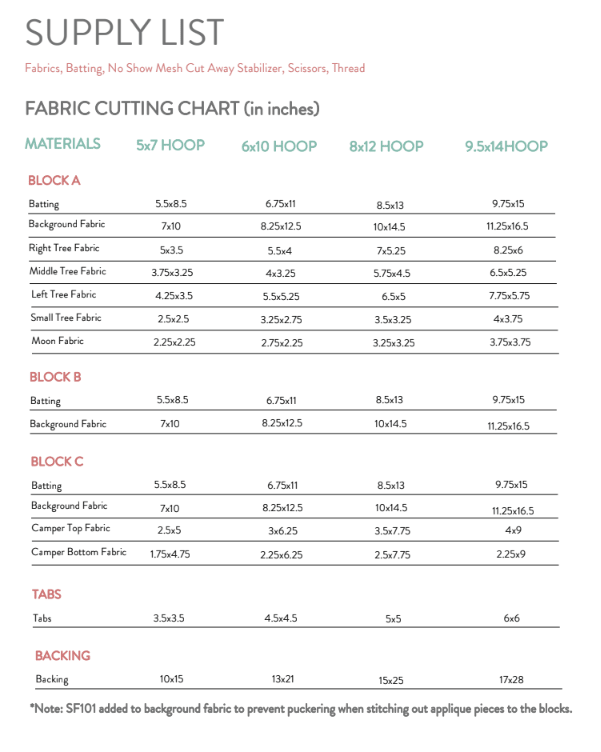 Fabric amounts will vary depending on your hoop size. We’ll provide a fabric requirements guide prior to class so you can cut and prep with confidence. See amounts on second photo.